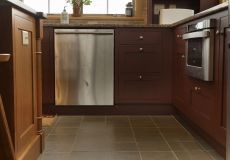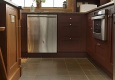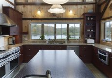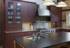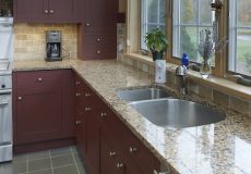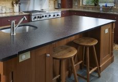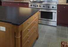 - Ceasarstone “Basalt” textured quartz countertop over cherry cabinets on the island