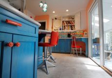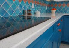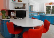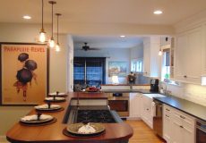 - Neutral-colored Cambria quartz countertops with strikingly rich custom-made Grothouse ash wood freeform eating area for four diners.