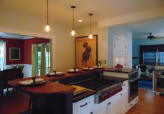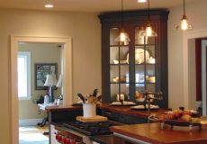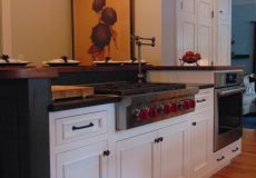 - Alberene Churchill soapstone countertops with raised custom Grothouse wood bar top in knotty ash.