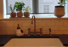 - Large Single Franke fireclay farmhouse sink with Whitehaus Collection period faucet.