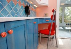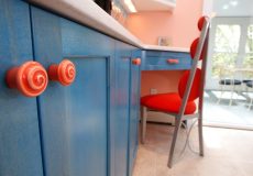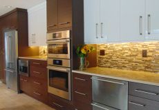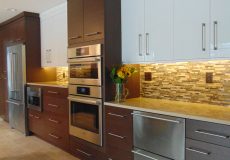 - Contrasting flat-paneled, glossy white acrylic upper cabinets against contrasting natural wenge wood lowers and tallers.