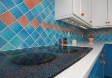 - Linear glass mosaic tile backsplash that nicely ties together the complex color-scheme.