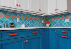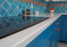 - Linear glass mosaic tile backsplash that nicely ties together the complex color-scheme.